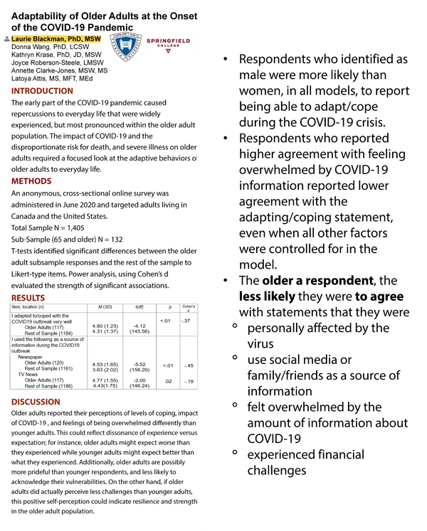 Dr. Laurie Blackman and Dr. Kathryn Krase, along with three Wurzweiler students—Joyce Roberson-Steele, Annette Clarke-Jones and Latoya Attis—and Dr. Donna Wang of Springfield College presented a poster at the Gerontological Society of America’s 2021 Annual Scientific Meeting, “Disruption to Transformation: Aging in the ‘New Normal’,” held online from November 10-13, 2021.Titled “Adaptability of Older Adults at the Onset of the COVID-19 Pandemic,” the data presented in the poster led to the conclusion that “the older a respondent, the more likely they were to agree with statements that they adapted to/coped with the COVID-19 outbreak, used the newspaper and TV news as a source of information, were able to evaluate information about COVID-19 based on the quality and source of the information, [and] experienced transportation challenges.”